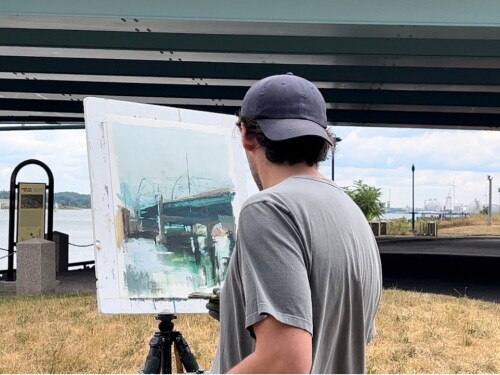 Green’s recent excursion to the I-95 Bridge showed the artist paint en plein air between the highway and the levees. He has a knack for transforming an ordinary, dreary day into something special on his canvas.