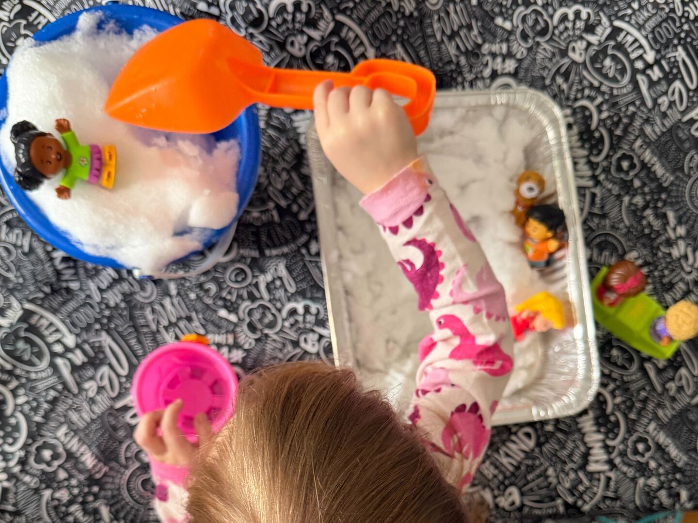 - Bring the snow inside: Collect a couple of buckets and play with small figures, utensils, or other indoor items in a shallow pan or the tub.