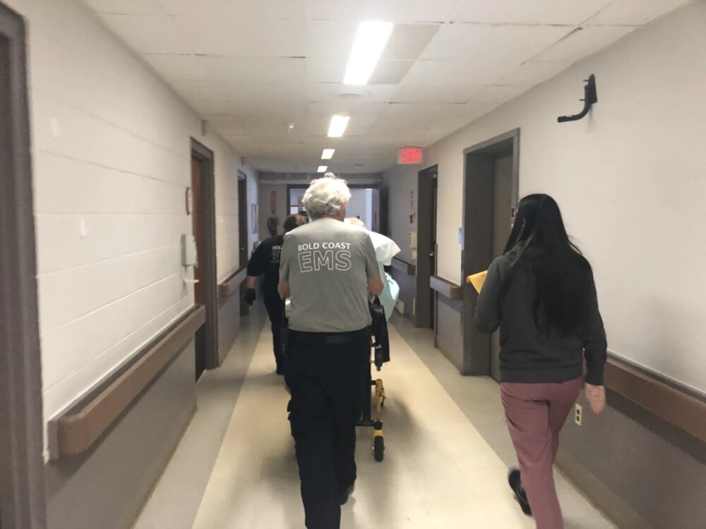 The crew wheeled the woman on a stretcher down a bare hall that once sported artwork and photographs.
