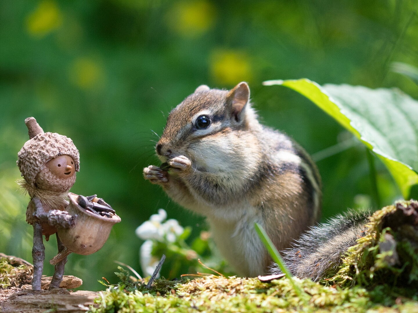 As delightful as they are, the Becorns themselves are part of a bigger picture. Bird bestows each little being with a carefully chosen name, personality, family, friends, and foes. Like any woodland creature, Becorns have complex social systems; relationships among their clans and with the fellow inhabitants of their biome: squirrels, birds, chipmunks and other backyard creatures. After dreaming each Becorn into being, Bird creates a variety of scenarios intended to reflect the joys, frustrations, and situations Becorns might find themselves in — feeding a chipmunk, battling a squirrel, carrying a basket of seeds home for supper, splashing in a birdbath with a feathered friend. Once he sets the scene, he works to capture the perfect moment in a photograph, a seemingly impossible, perfectly enchanting moment forever frozen in time.